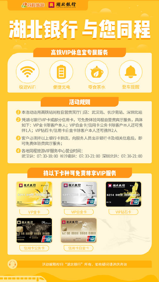 2、凭湖北银行信用卡可享受同程服务贵宾厅服务,具体如下: